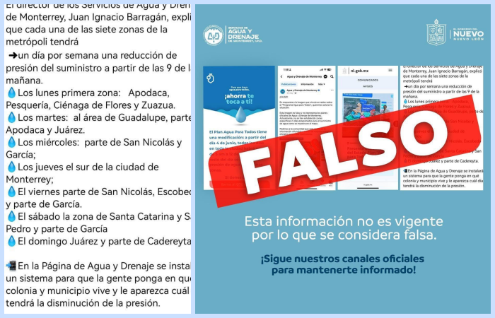 Monterrey, Nuevo León.- Servicios de Agua y Drenaje de Monterrey desmiente la información que circula en redes sociales sobre cortes en el suministro de agua potable, debido a que esta no es vigente.