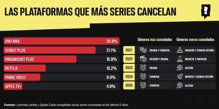 Datos recopilados por la plataforma Spoiler reflejan que cada servicio cancela en promedio cinco o más series al año. Entre las principales razones figuran las bajas visualizaciones, la mala recepción por parte de la audiencia o las polémicas que involucran a showrunners y actores.