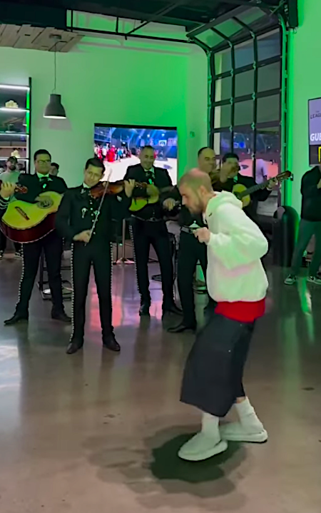 El artista canadiense asistió a un evento promocional de su marca de ropa SKYLRK, realizado en los SRGN Studios, donde sorpresivamente fue recibido por mariachis. Aunque en un principio pasó de largo, Bieber regresó al escuchar la música y comenzó a bailar al ritmo del grupo, imitando los pasos del vocalista e intentando seguir la letra del tema “Hermoso cariño”.