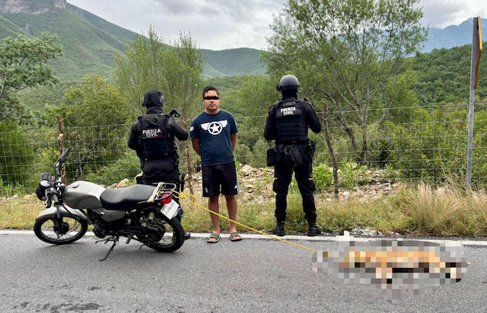 Elementos de Fuerza Civil detuvieron a un joven en el municipio de Rayones, acusado de maltrato animal tras presuntamente quitarle la vida a un perro y trasladarlo amarrado en su motocicleta.