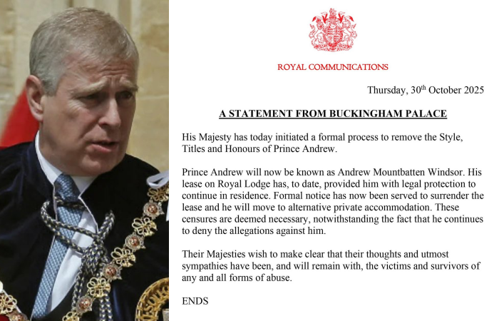 “Su Majestad ha iniciado hoy un proceso formal para retirar el tratamiento, los títulos y los honores del príncipe Andrés. El príncipe Andrés pasará a ser conocido como Andrés Mountbatten Windsor”, señala el comunicado.