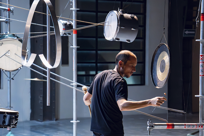 “Batería Suspendida” resultó ser un performance sonoro dentro de una instalación que trasciende las barreras convencionales de la música y el arte. La pieza ofrece una exploración sensorial inherente a los componentes de la batería, que en esta ocasión fue concebida como un instrumento-instalación suspendido en el aire, interconectado por cuerdas de piano y resortes, transformando los tambores en resonadores.