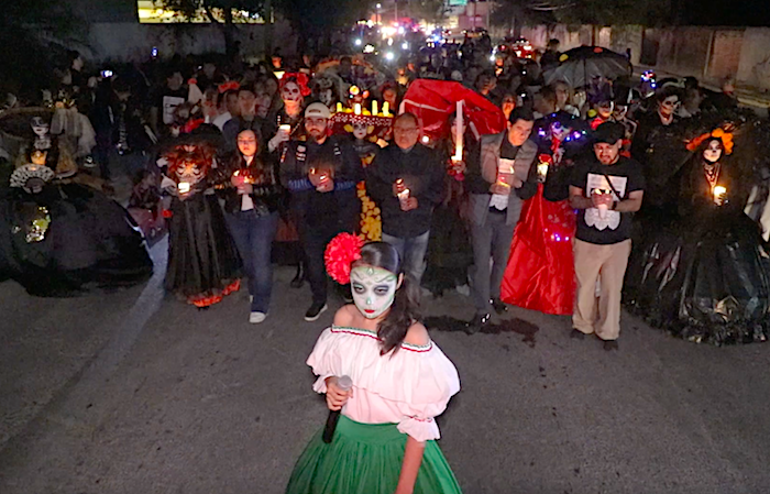 El desfile hizo una pausa especial en el Panteón Jardín del Edén, donde el Alcalde Andrés Mijes, acompañado de su familia y del Secretario del Ayuntamiento, Felipe Canales, encabezó una procesión iluminada por decenas de velas, símbolo de amor eterno hacia quienes ya partieron.