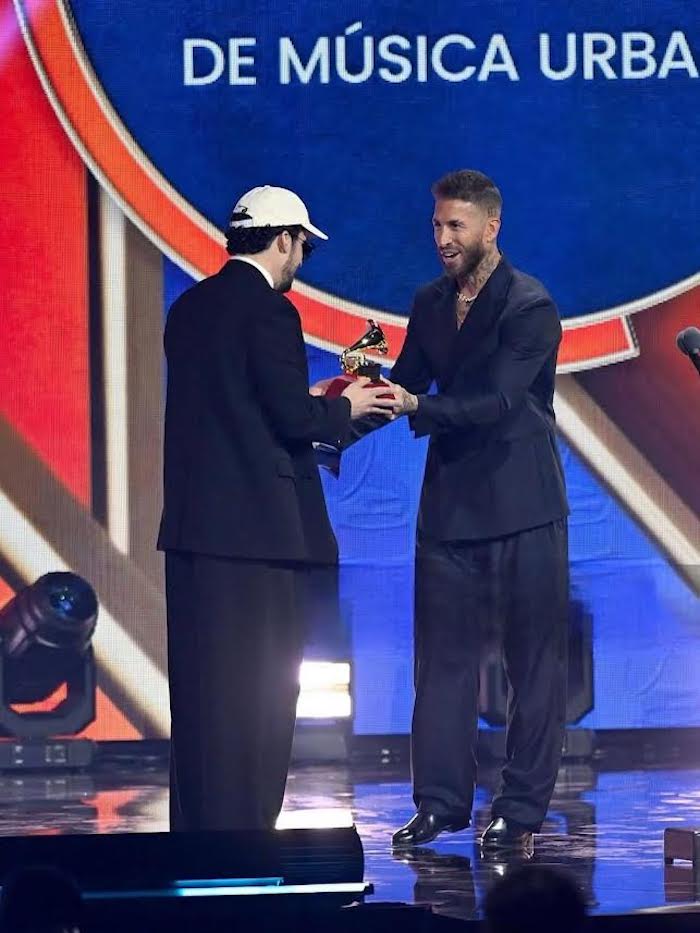 Entre tantas estrellas de la música en Los Latin Grammys, el defensivo de Rayados Sergio Ramos se robó cámaras al presentar el premio al Mejor Álbum Urbano y en una escena que ni siquiera la IA se pudo imaginar, Ramos terminó entregando el galardón a Bad Bunny, máximo favorito con 12 nominaciones.