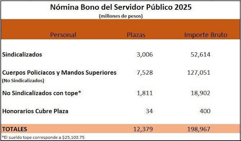 El informe también detalla que tres mil seis empleados sindicalizados recibieron 52 millones 614 mil pesos, mientras que un grupo de mil 811 trabajadores no sindicalizados obtuvo 18 millones 902 mil pesos. Además, 34 personas contratadas bajo el esquema de honorarios fueron incluidas en esta dispersión con un monto global de 400 mil pesos.