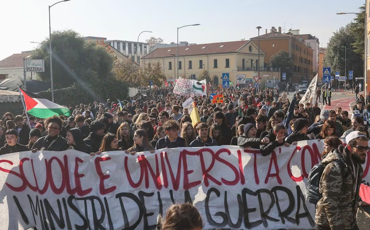 “Vamos a bloquear las escuelas y universidades por una nueva educación, contra las escuelas [del ministro de Educación] Valditara y las universidades [de la ministra de Educación Superior] Bernini, por una Palestina libre, por un mundo nuevo”, declaran los estudiantes manifestantes.