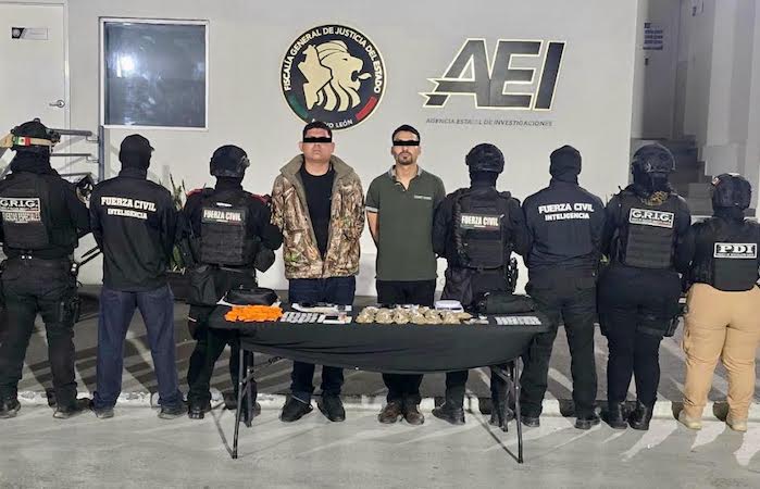 Los detenidos se identificaron como Omar N., de 19 años; Ángel N., de 23, y una menor de 17 años de edad. Durante la revisión, las autoridades aseguraron dos armas cortas con cargadores y 27 cartuchos hábiles, además de 101 dosis de hierba verde y seca con características de marihuana y 98 dosis de una sustancia granulada y cristalina con características de cristal. También fueron decomisadas dos básculas digitales, un teléfono celular y dinero en efectivo.