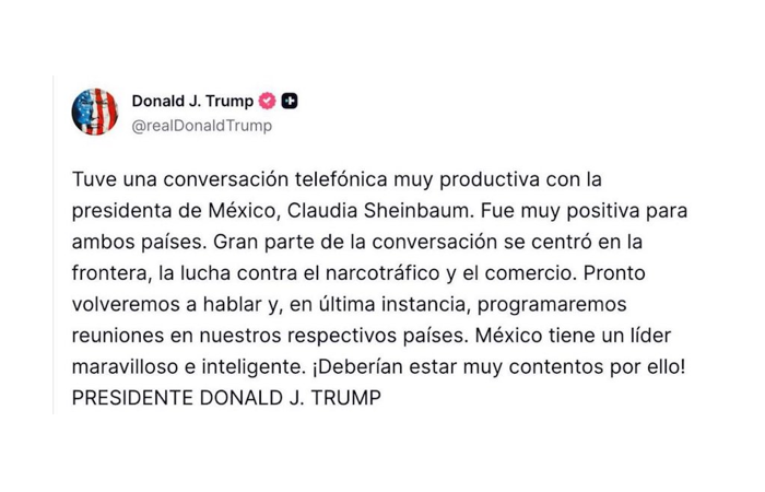 “México tiene una líder maravillosa y muy inteligente, ¡deberían estar muy contentos por ello!”, escribió Trump en su plataforma Truth Social.