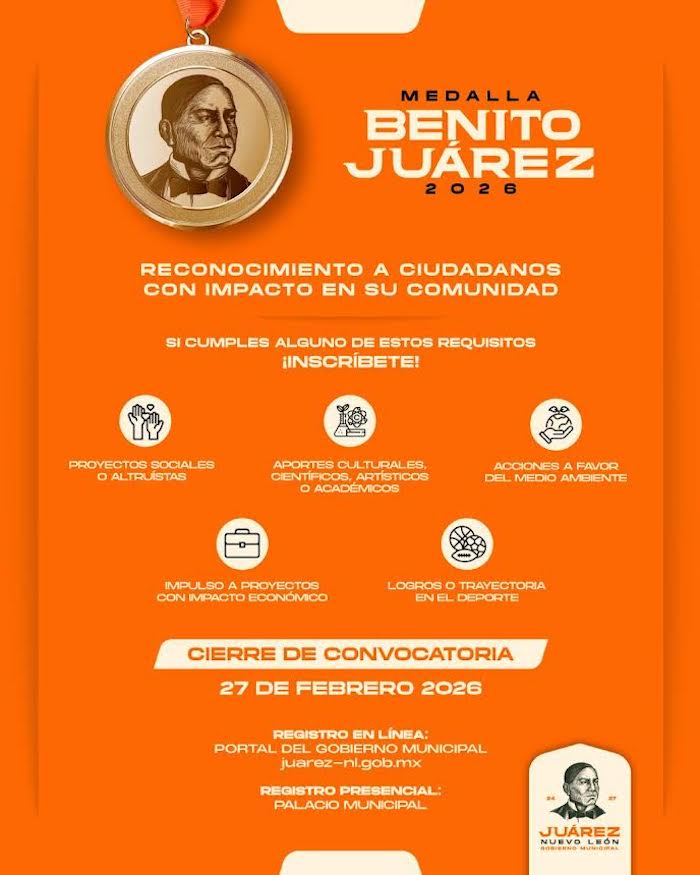 El Gobierno de Juárez lanzó la convocatoria para postular a la Medalla Benito Juárez 2026, un reconocimiento que distinguirá a 10 ciudadanas y ciudadanos que hayan destacado por su aportación al desarrollo del municipio en los ámbitos académico, cívico-social, ambiental, de emprendimiento y deportivo.