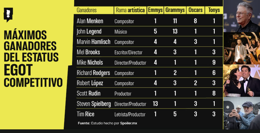 Un análisis de la plataforma Spoiler.mx identifica a poco más de una veintena de figuras que han logrado el EGOT competitivo, un grupo selecto que ha dejado huella en el cine, la música, la televisión y el teatro. Entre ellos, el caso más llamativo es el del compositor Robert Lopez, quien no sólo fue el más joven en completar la cuádruple corona, sino el único en ganar cada uno de los cuatro premios al menos dos veces en competencia. Su trabajo va de Broadway a Disney, con títulos que marcaron época tanto en los escenarios como en la pantalla grande.