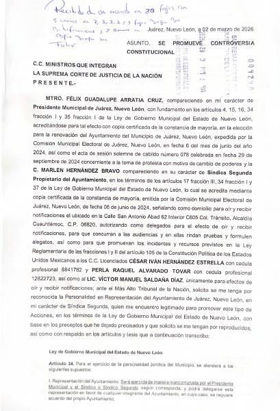 El alcalde de Juárez, Félix Arratia Cruz, promovió una controversia constitucional ante la Suprema Corte de Justicia de la Nación (SCJN) para que se revise la legalidad de diversas multas y requerimientos emitidos por el Instituto Estatal de Transparencia, Acceso a la Información y Protección de Datos Personales del Estado de Nuevo León.