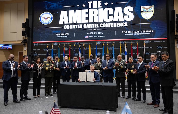 El secretario de Guerra de EU, Pete Hegseth, firmó la Declaración de Seguridad de la Conferencia Anticárteles de las Américas, en la que participaron 17 líderes regionales de defensa y seguridad del Caribe, América Central y América del Sur con el fin de “alcanzar objetivos comunes en materia de seguridad”, según el Pentágono.