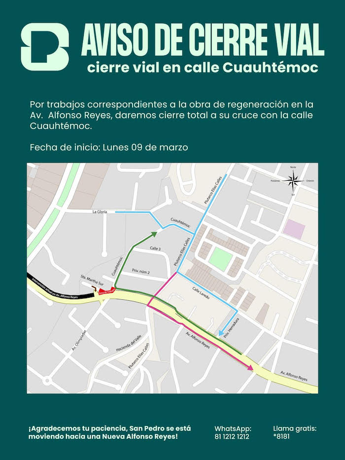 Como parte de los trabajos de regeneración de la avenida Alfonso Reyes, el Municipio de San Pedro Garza García anunció el cierre total de la incorporación de la calle Cuauhtémoc hacia esta importante vialidad a partir del lunes 9 de marzo.