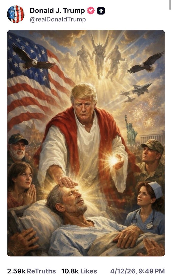 La ilustración —claramente generada con inteligencia artificial— muestra al exmandatario en una escena de tintes religiosos: con vestimenta similar a la de Jesucristo, imponiendo las manos sobre un hombre enfermo mientras figuras celestiales, luz divina y símbolos patrióticos estadounidenses lo rodean. La narrativa visual no deja lugar a dudas: se trata de una representación de carácter casi mesiánico.