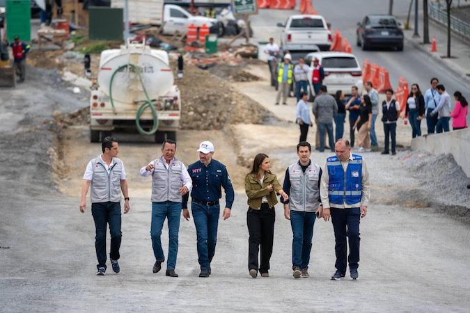 El alcalde de Monterrey, Adrián de la Garza, supervisó los trabajos del Circuito Vial Huajuco, el cual registra un avance general del 80 por ciento y forma parte de un conjunto de al menos seis obras de infraestructura en la zona sur de la ciudad.