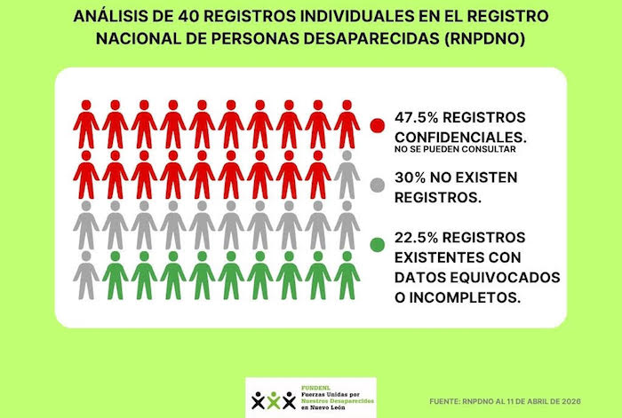 Fuerzas Unidas por Nuestros Desaparecidos en Nuevo León (FUNDENL) presentó una actualización de su análisis sobre 40 casos del Registro Nacional de Personas Desaparecidas y No Localizadas (RNPDNO), originalmente revisados en 2024, en el que se advierten persistentes problemas de acceso, clasificación y disponibilidad de información para las familias.
